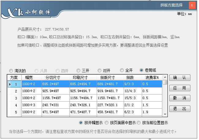 另外,选择一个方案时,窗口上面会显示该方案的产品尺寸及咬口,边距,间距(双单刀)等参数,要认真检查是否合适